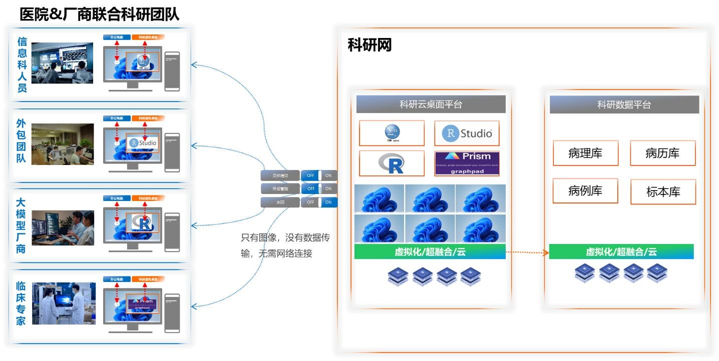 通过虚拟桌面实现满足研发团队在外网调阅院内数据的同时,又不会有数据流出到外网,确保医疗数据安全性;