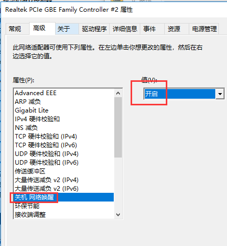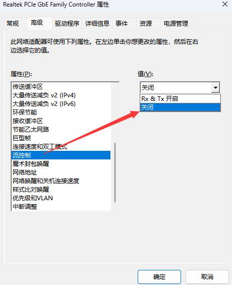 3、将“流控制”改为关闭,“关机网络唤醒”改为开启。