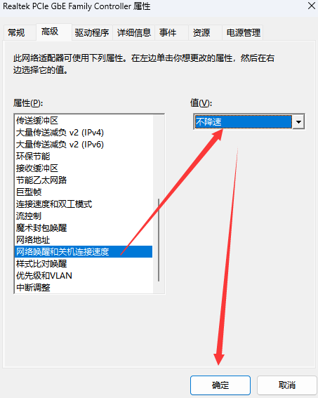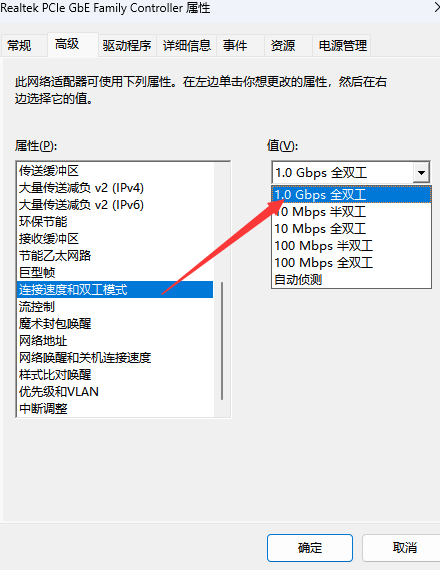 1、先查看样机的网卡适配器是否是千兆网速,若不是则检查网线是不是千兆网线,以及查看设备管理器将连接速度改成不降速。