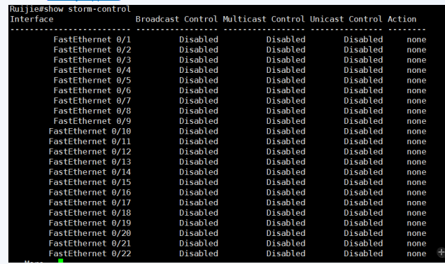 3、关闭组播、广播、单播抑制后通过show storm-control查看端口上的这些协议的开启状态,如下: