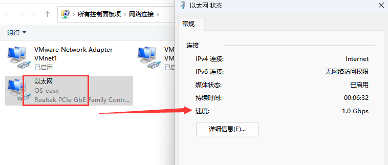 1、首先打开控制面板-网络和internet-更改适配器设置,双击网卡,查看当前连接速度是不是千兆速度,如果不是,则需要更换网线。