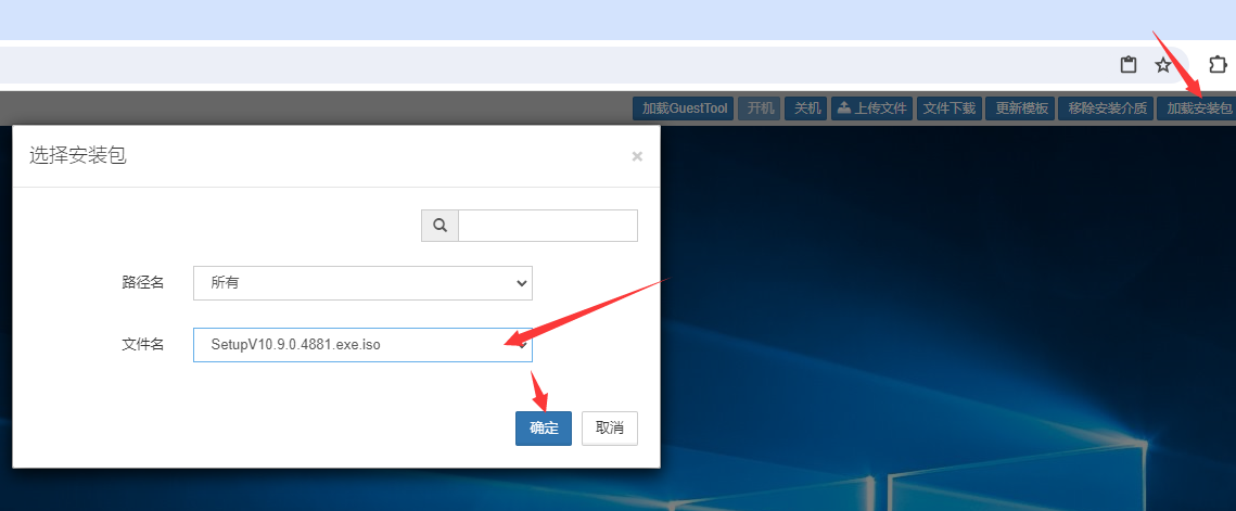 3、模板开机之后,点击右上角的“加载安装包”,点击文件名的下拉框找到需要安装的软件,点击确定。