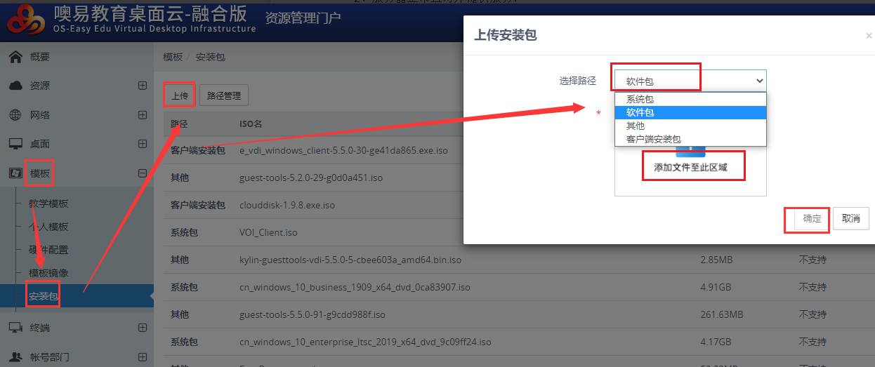 1、登录管理平台后,点击模板---安装包---上传,点击“上传”,上传安装包。上传软件到对应的位置,比如上传到软件包位置,然后添加文件上传。(支持rar压缩文件、exe文件、ISO文件)