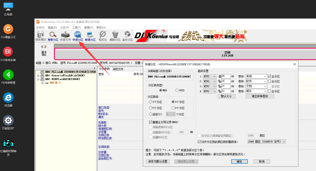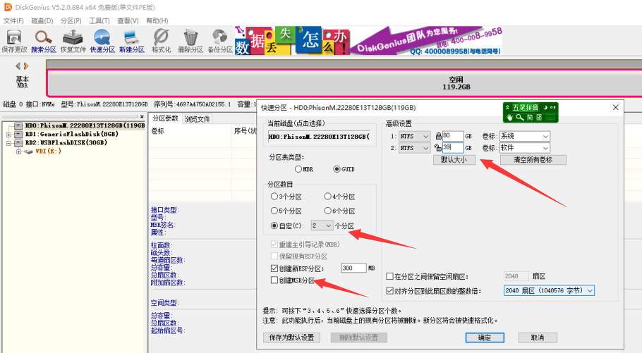 ② 选择自定义分区,2个分区,分区大小调整为合理状态;
