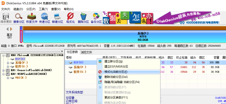 ③ 确定后创建三个分区,其中ESP为引导分区,剩下为系统盘和数据盘。选中分区,鼠标右键格式化三个分区;