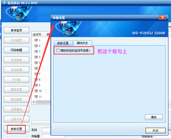 3) 需清除差异拷贝连线信息:若遇到接收端有响应发送端,但没有连线号,可尝试在发送端系统内差异拷贝界面的“参数设置---清除历史,清除锁定的连线号信息”,如下图。再打开发送端差异拷贝点等待登录,连接测试。