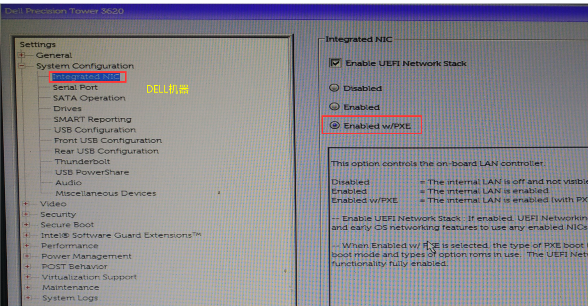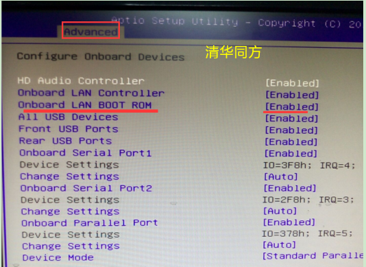 ④、OSS V5要BIOS里开启传统Pxe rom(有的BIOS设置里为onboard lan boot rom),如下图,以清华同方、DELL、联想机器的BIOS设置为例。