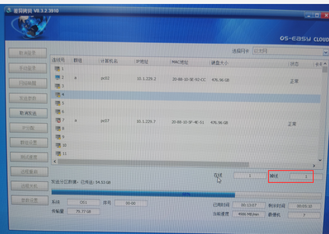 1) 采用的linux文本模式,但发送端系统内IP地址尾数太大:windows上层差异拷贝linux模式发送端,系统下网卡的IP地址尾数太大,导致差异拷贝等待登录时,接收端只能少部分接收端有连线号,大部分接收端没有连线号。如发送端IP地址是192.168.100.253/24,那么接收端就只有1台有连线号,其他的接收端有响应,但没连线号。此时需将发送端IP尾数改小,可改成1,这样先临时修改下,等同传完重启发送端即可还原成它本身的IP地址。