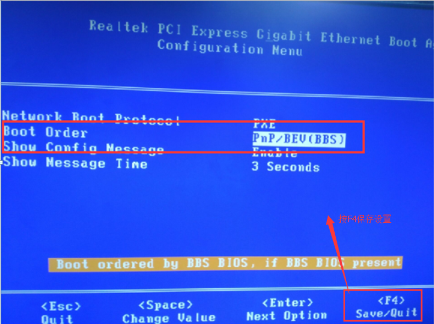 ③、OSS V4和V5版本,电脑的开机shfi F10 pxe模式设置中的Boot order要修改成PnP/BEV BBS模式(如清华同方的电脑,开机屏幕左上角会提示按Shift F10进入),如下图: