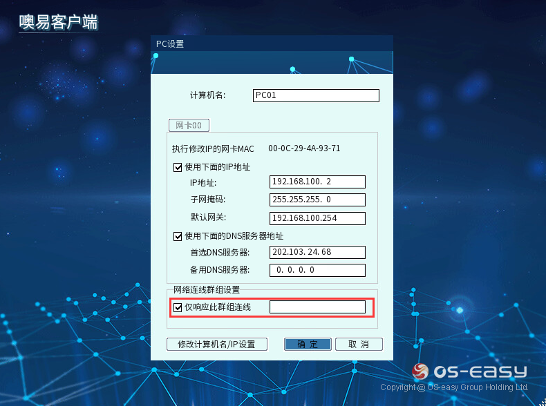 2)、OSS系统群组不一致:差异拷贝同传连接时,发送端和接收端的OSS群组名称必须一样,要不然是连不上的。您可进底层F10---PC设置或差异拷贝主界面确认和修改群组,如下图: