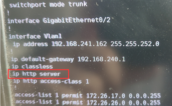 附思科交换机启用 ip http server方法 :交换机之前配置的是no ip http server,要执行 ip http server 启用,如下图: