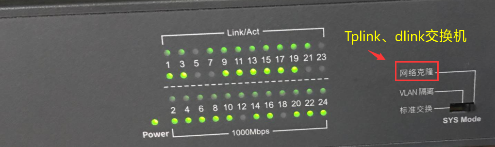 3) 修改交换机工作模式:若现场是Tplink、Dlink、华为交换机,其前面板上可手动切换交换机模式,切换到网络克隆或流控关闭模式,如下两图: