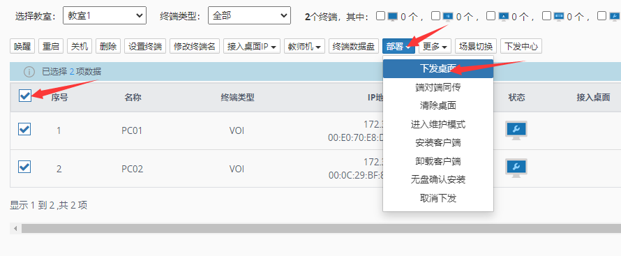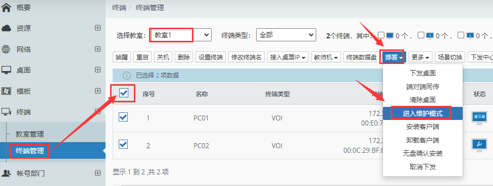 1、模板更新完成后,需要给终端学生机同步下发桌面,打开终端管理,全选终端,点击部署,点击进入维护模式。