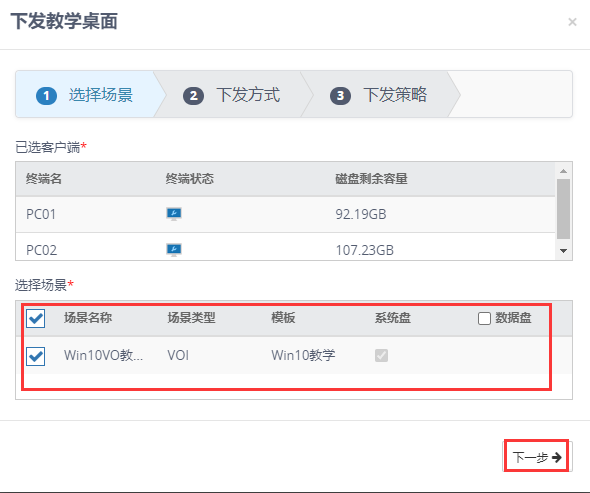 3、在选择场景里面勾选中刚才更新的模板关联的桌面,点击下一步,点击完成。