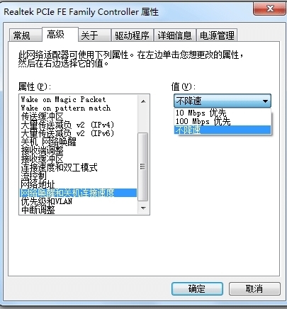 1.先把所有交换机断电几分钟后,再通电开交换机,再测试网络(差异)拷贝速度 2.传系统时,所有机房电脑都开机。(不用传的电脑也开启来 进系统都行);另拔掉机房外网出口线。保证交换机上的显示灯都是绿色,代表100M或1000M速度(橘黄色代表端口工作在10M速度);如果机房有外网出口线,把外网线先拔掉。 3.如果还是不行,在样机系统下设备管理器,找到网络适配器,本机网卡的右键"属性"—"高级"里的关机网络连接速度改成100Mbps或不降速 (如下图,备注XP系统没有不降速,改成100Mbps优先即可);如果您用我们的OSS装了多个系统,那么每个系统都必须改这个设置,当然有些系统可能没有这个设置,那您可以不用管它。样机设置好后,把所有电脑开机连上这台样机的差异拷贝,把每个系统的C盘,差异传输下即可。