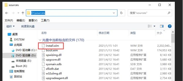 在pe系统中,解压原版的ISO镜像,或者对ISO文件使用右键加载到虚拟光驱,找到镜像包中sources文件夹下的install.wim文件.这个是windows的安装打包文件.类似于ghost的gho镜像.