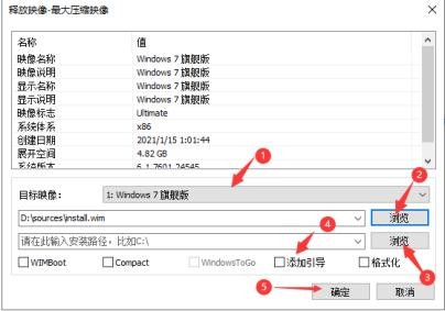 目标映像选择要安装的镜像版本,图中安装的win7,选的旗舰版.第一个浏览中选择上面要找的ISO镜像包中install.wim文件,这一步是找镜像源.第二个浏览是指安装到哪个分区,这里选要安装到的系统分区.然后勾选添加引导,确认没问题后点确定开始释放系统文件.