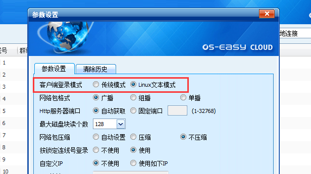 2.把参数设置中的登录模式切换一下测试发送是否正常,默认是linux文本模式,就切换到传统模式,然后重新打开差异拷贝软件开启等待登录同传参数.如果默认是传统模式,改为linux文本模式测试.