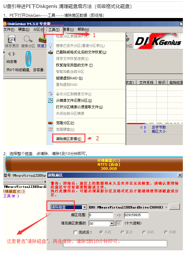低格方法:进入PE系统,打开桌面上的diskgenius软件,找到磁盘扇区清理,如果有多个硬盘,每个需要清理三分钟,清理后点取消,重启重装底层系统.如果时间足够,可以考虑整个磁盘全部低格完成.
