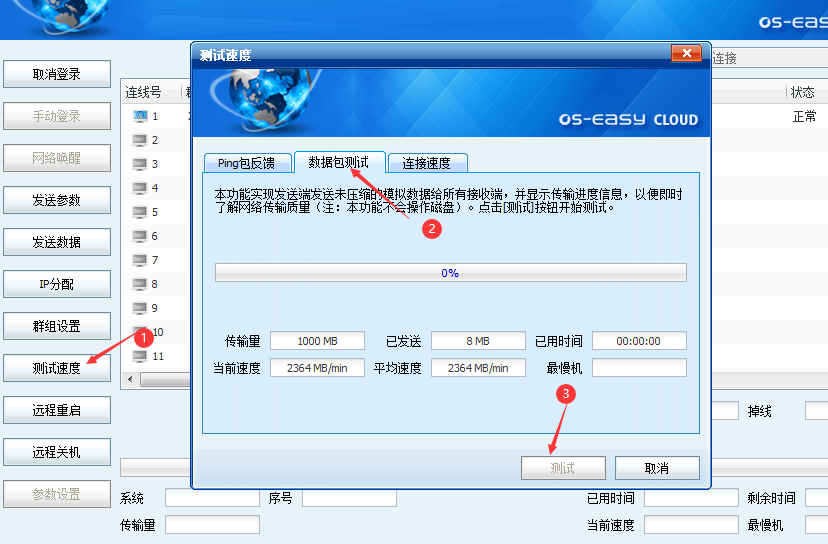 1.使用差异拷贝的测试速度-数据包测试功能,对接收机批量测试发送速度,如果发送速度过慢,1分钟只有60M或以下,需要检测,检测交换机灯口是否有红灯设备,部分机器局域网网络速率异常,会导致整体传输过慢或掉线,需要拔掉网线重新接入或更换网线.