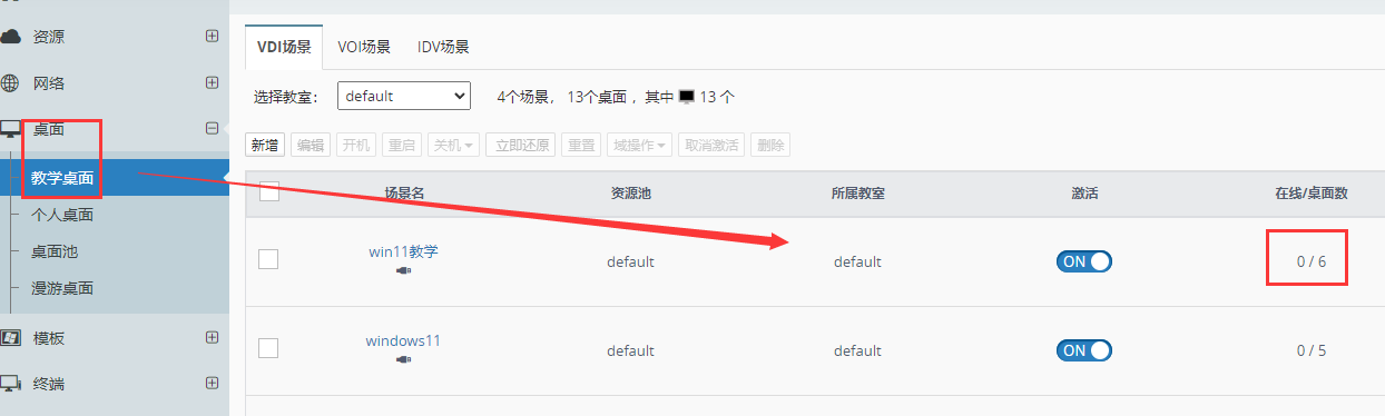 1、登录管理,进入教学桌面,根据所属教室和桌面场景名称找到需要修改还原方式的桌面。