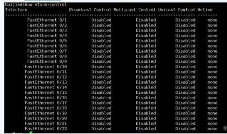 2、Switch#show storm-control broadcast ……查看所有交换机端口的广播抑制情况(是开启还是关闭或者开启了多少百分比)
