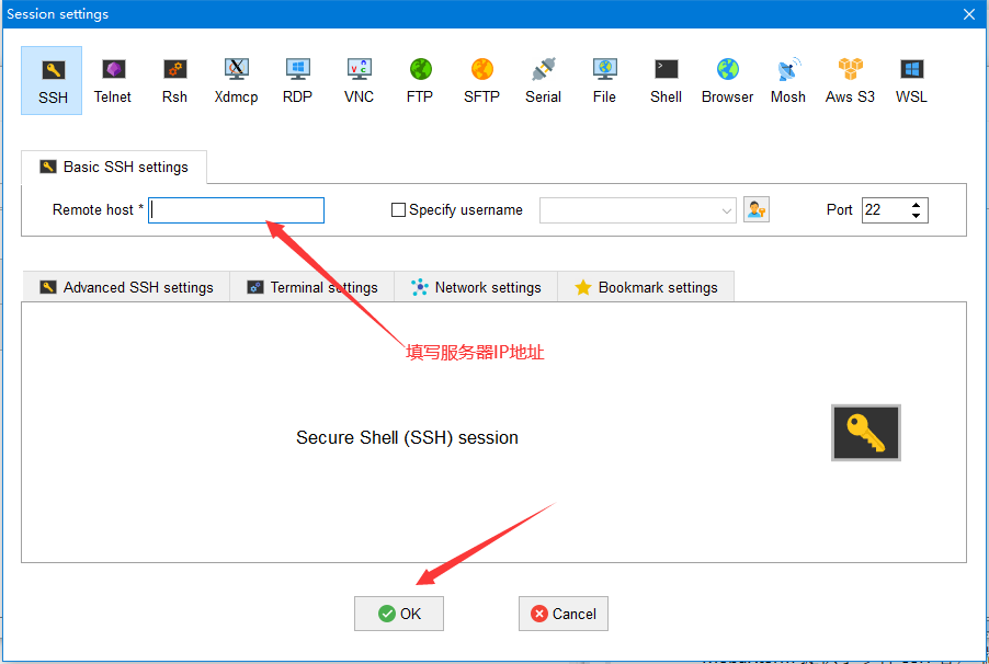 (2)点击Session会话设置,选择ssh连接,主机名输入相应IP地址,点击OK确定连接;