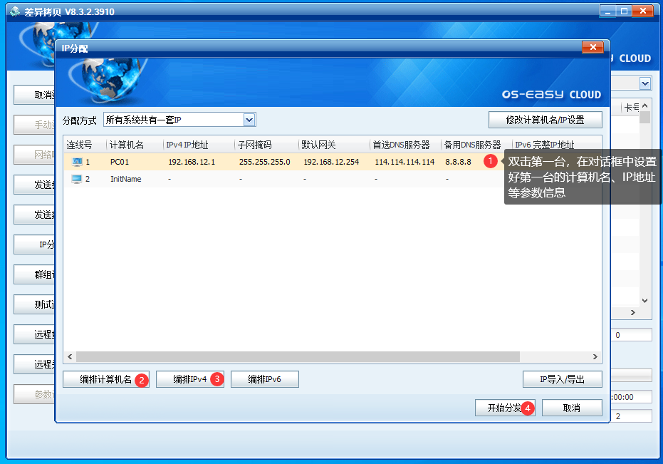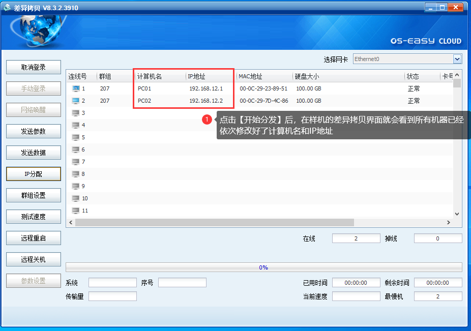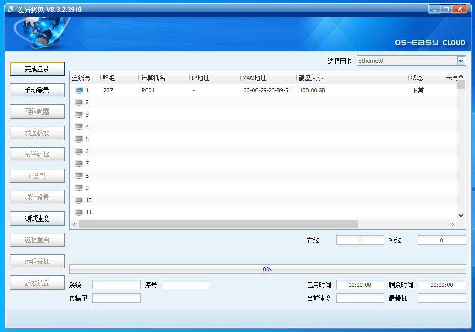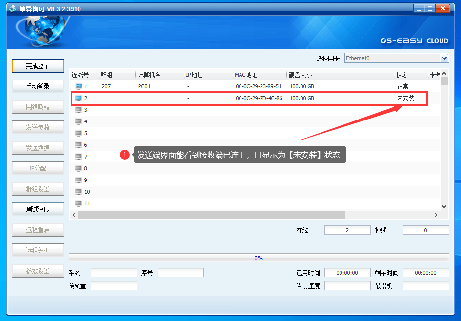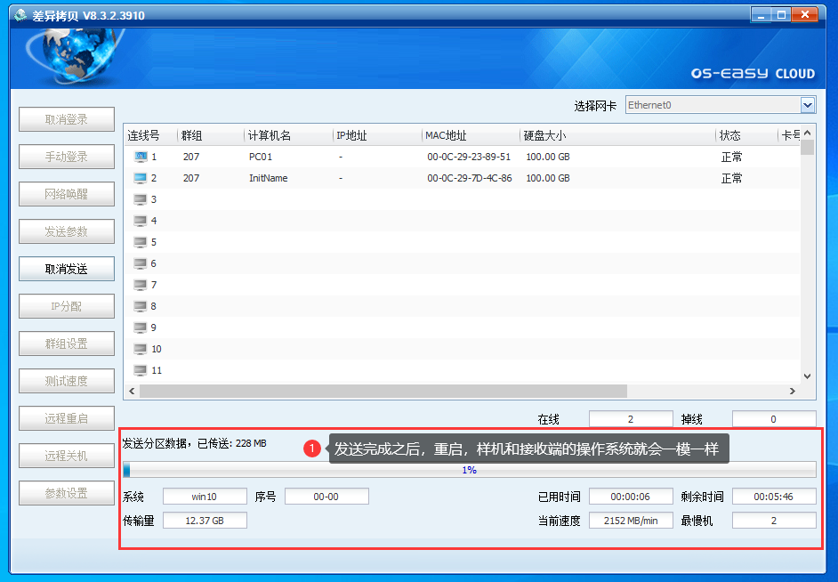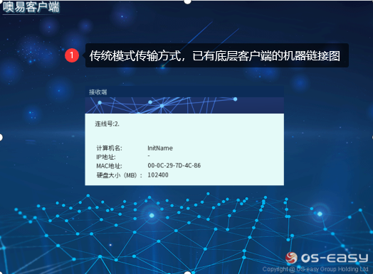 在新装的OSS教室环境下,通常只手动安装一台样机(即第一台模板机,也称为发送端),其他学生机则通过样机的差异拷贝功能,将底层客户端、操作系统等数据直接传输到其他机器,以此来实现机房的快速部署,缩小实施人员部署机房的工作量。