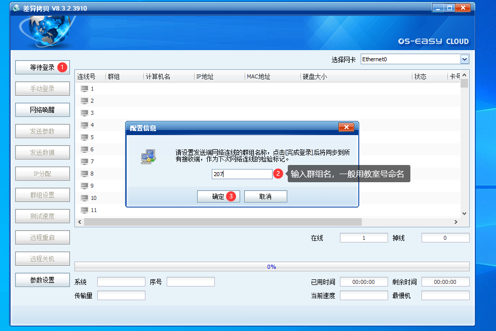 ② 样机点击等待登录,首次点击等待登录时,会让您输入群组名,该群组名是自定义的,一般用教室号来命名,不能有特殊字符。