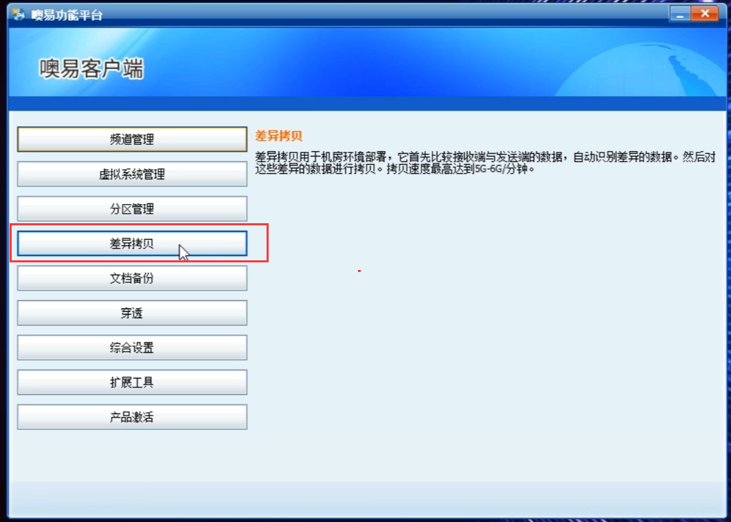 ① 样机进入到windows操作系统中,点击桌面右下角的蓝色小球图标(或按Ctrl L快捷键)呼出上层客户端,并依次点击【噢易功能平台——差异拷贝】按钮,在登录界面输入用户名 sys ,密码登录进去(密码默认是空白的,如果您在底层F10系统管理里有设置过密码就输入您的密码),进入到差异拷贝功能界面