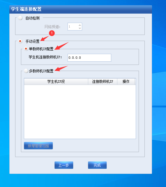 4.如果是一个教室使用,选择“手动设置”->“单教师机IP配置”,多教室多教师机选择“多教师机IP配置”,配置完成点“完成”按钮保存ip设置;