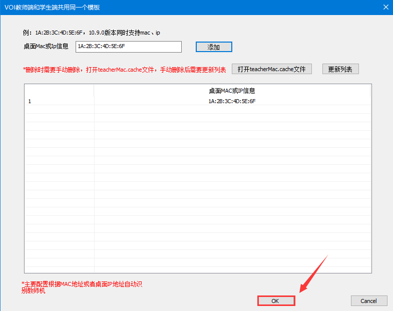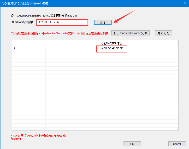 7.按格式填写教师机的mac地址,如果是多个教师机,写一个mac地址后点击“添加”,再写第二个mac地址添加;