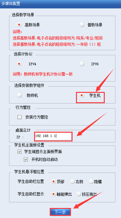 3.安装教学组件选学生机,填写桌面云服务器IP,点击下一步;