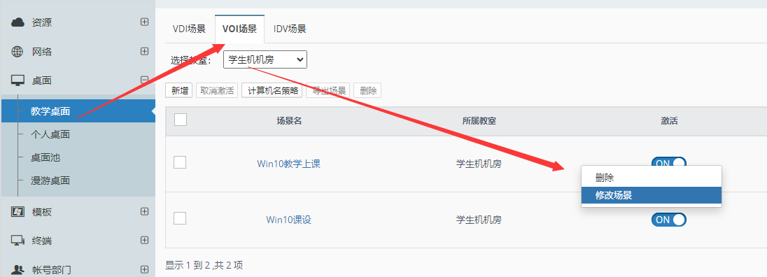 1、登录管理,进入教学桌面,根据所属教室和桌面场景名称找到需要修改还原方式的桌面,右键点击场景空白处,选择修改场景