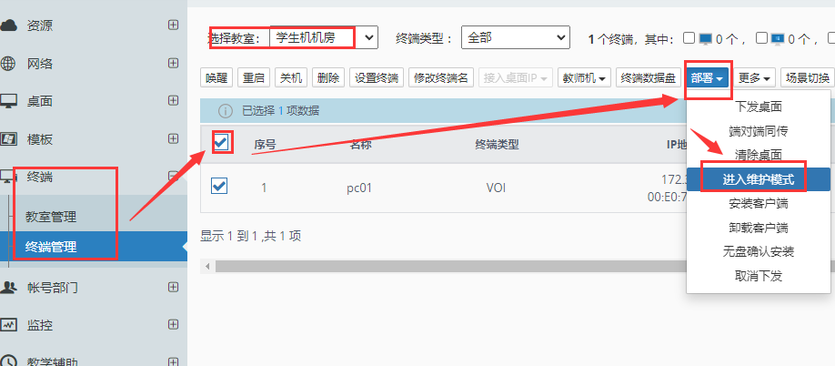 3、进入终端管理界面,选择修改还原方式的教室,全选选中终端学生机,点击部署,点击进入维护模式,终端进入维护模式等待一分钟左右后,等待终端与服务器同步完成,将终端全部重启就修改完成了。