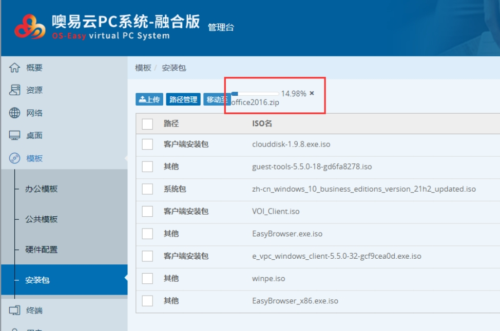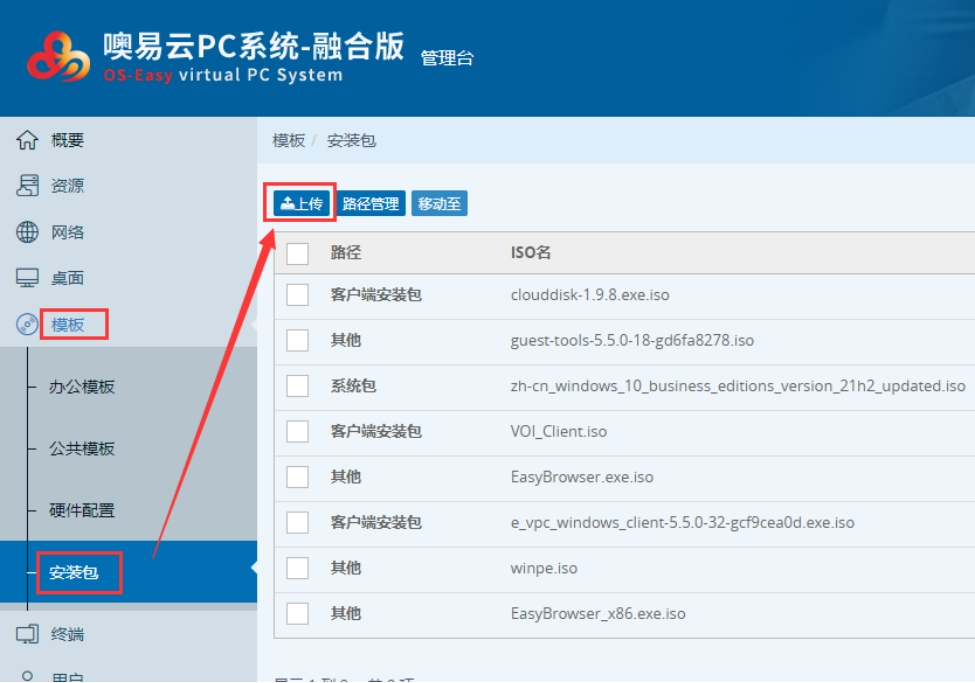 ①:安装软件之前需要先上传软件安装包到管理平台上,选择『模板』→『安装包』→点击『上传』。