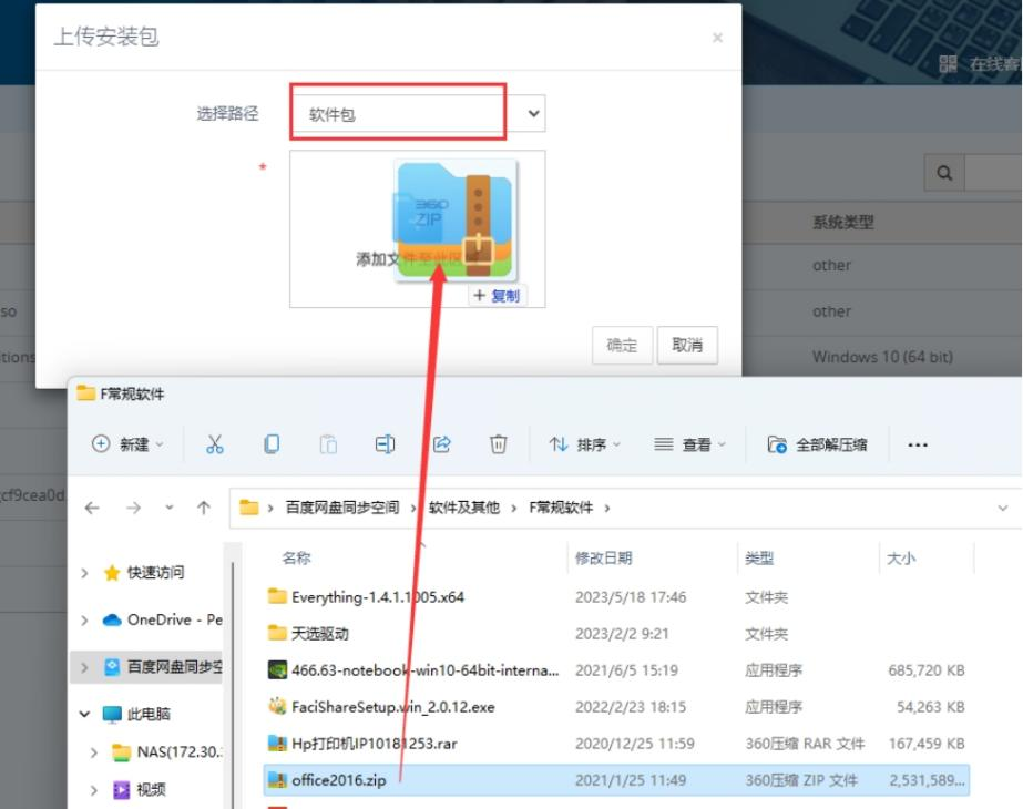 ②:选择路径为软件包,将安装包拖入上传。