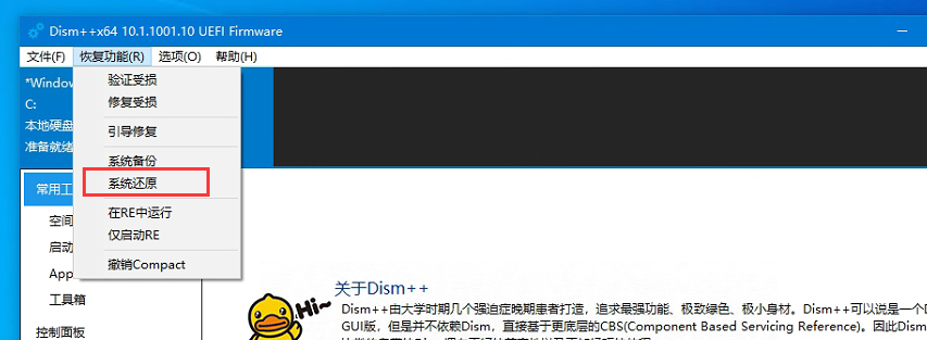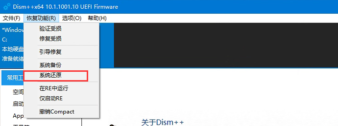 3.打开Dism 软件,选择恢复功能-系统还原选项;