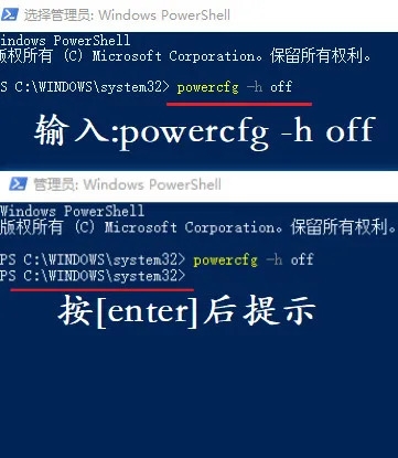 2.在出现的页面中直接输入:powercfg -h off ,然后按在键盘上按【enter】键。