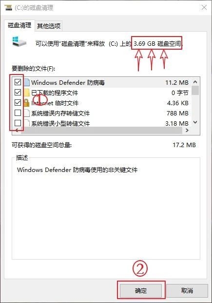 3.勾选需要删除的文件,点击【确定】后再点击【删除文件】,立刻为C盘释放了3.69G磁盘空间。