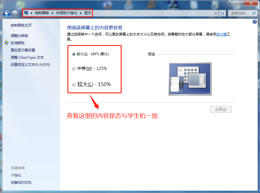 检查教师机的缩放布局是否与学生机一致,不一致则需要更改缩放比例