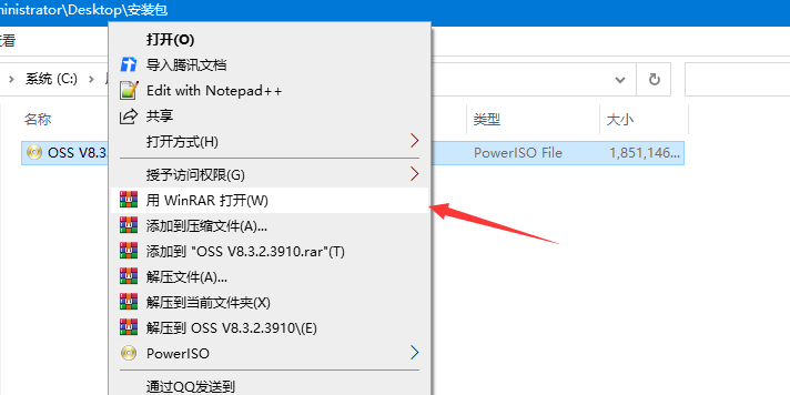 2、选择OSSV8安装包,右键用WINRAR压缩包软件打开;