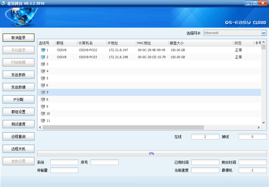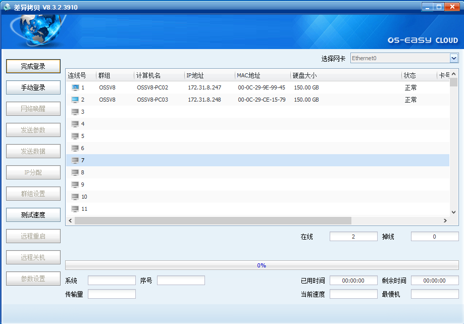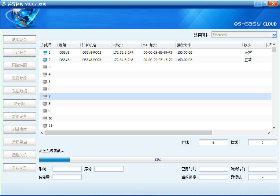 ③确认所有接收端机器都已连上差异拷贝发送端(即样机)后,点“完成登录”,就可以对接收端进行参数和磁盘分区数据的发送了。如下图: