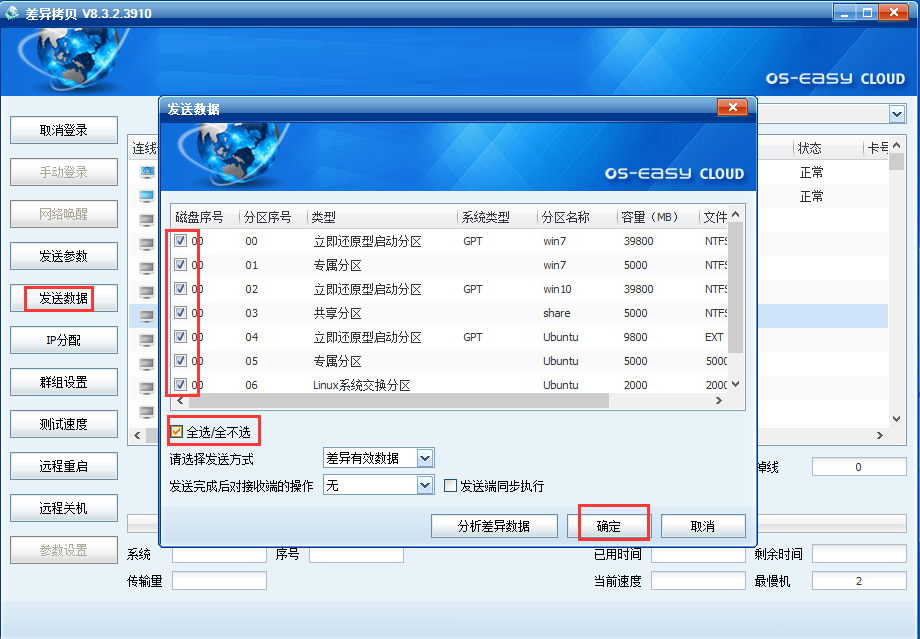 说明:勾选要同传的数据盘,选择差异有效数据(默认差异有效数据,一般就选择默认的即可),对机器的操作建议勾选 “无”,然后点击确定,直至发送端数据发送完成后,执行“远程重启”即可。