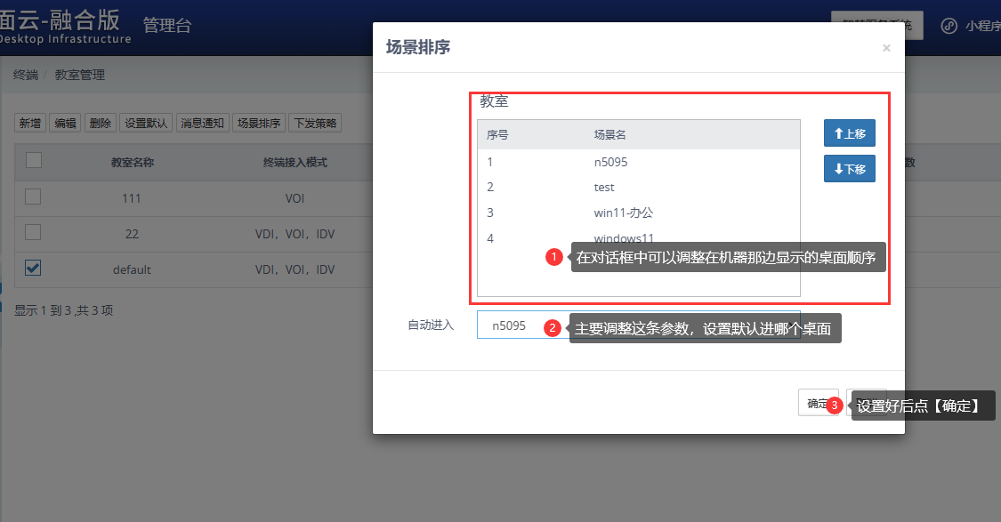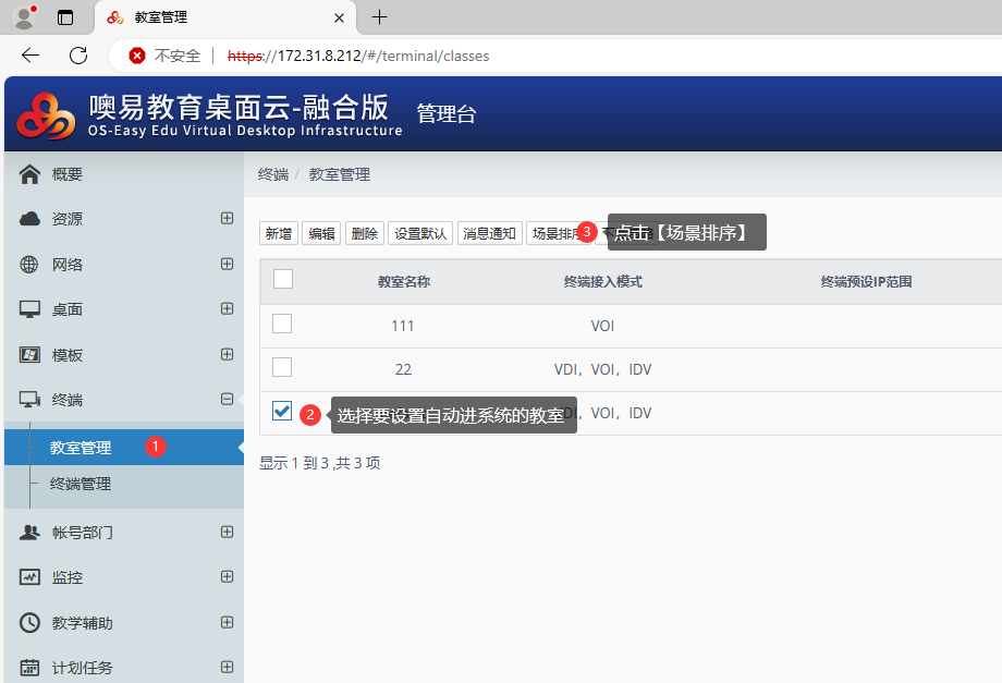 ⑥ 再进入到【终端——教室管理】中,选中要设置的教室,并点击菜单栏的【场景排序】