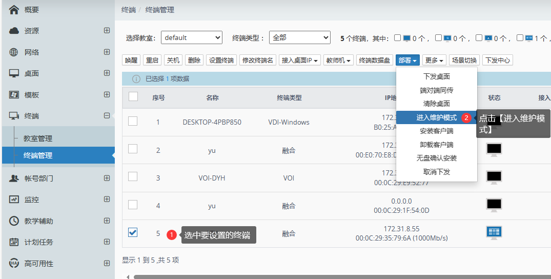 ③ 勾选要设置的机器,并点击上方菜单栏的【部署——进入维护模式】