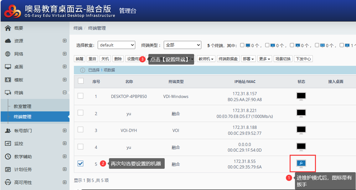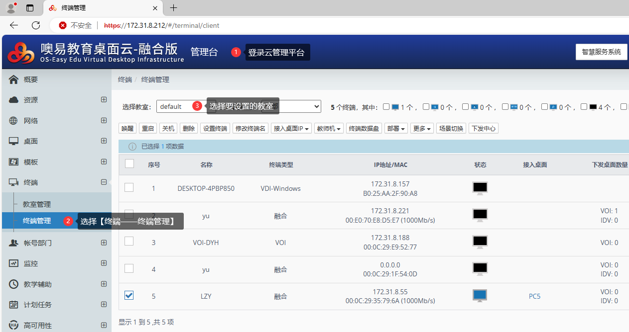 ② 登录到云管理平台上,找到【终端——终端管理】界面,选择好对应的教室