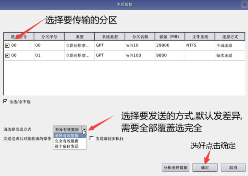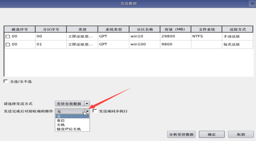 ⑤数据传输:需要批量分配计算机名或IP地址的,有专门文档编写,本文不过多讲解。每次使用差异拷贝的时候,必须先点发送参数,把oss底层的信息和分区信息等传给其他电脑,之后再使用发送数据功能