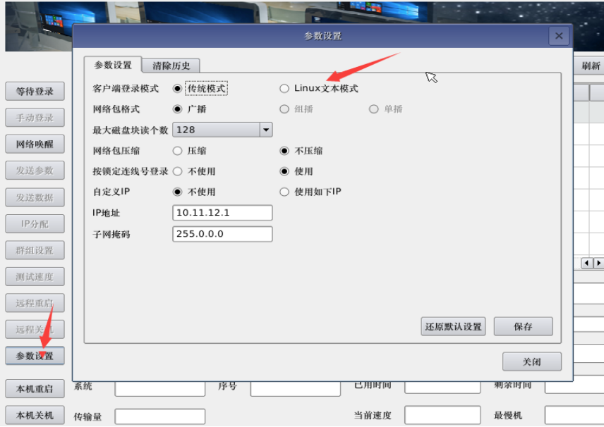 注意:如果发现传统模式传的很慢,或者无法传输。可以在开启等待加入之前,点击参数设置,切换为linux文本模式,linux文本模式兼容性差一点,但传输速度快很多。