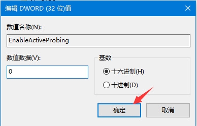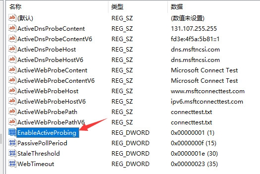 找到左边的Internet文件夹后,先点击Internet文件夹,然后双击右边窗口里的EnableActiveProbing选项,默认值是1,在数值数据中,把1改为0,点确定保存.